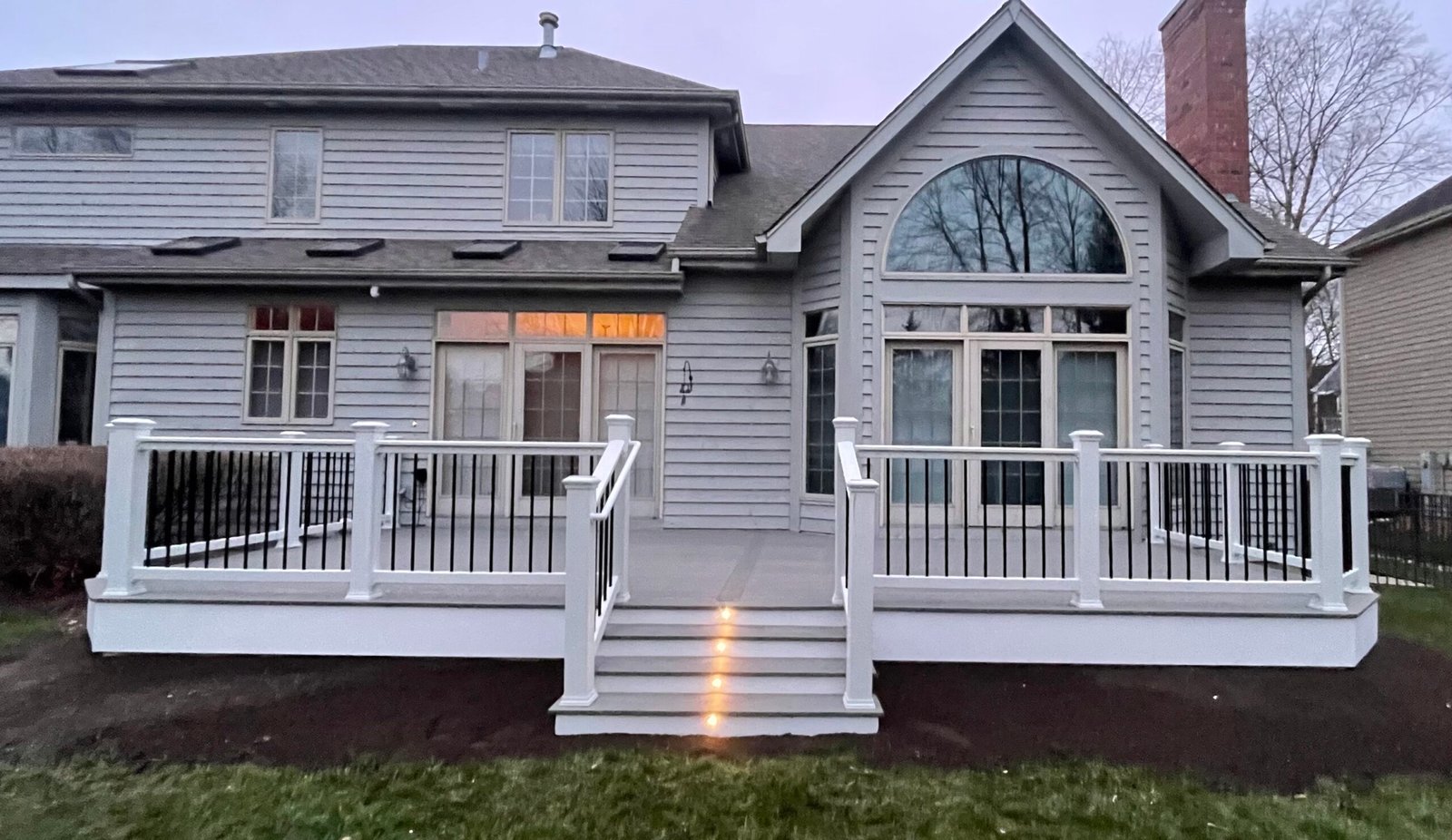 Timbertech decking in Sea Salt Grey, paired with Trex Select Rail in white with black aluminum balusters. White AZEK deck wrap