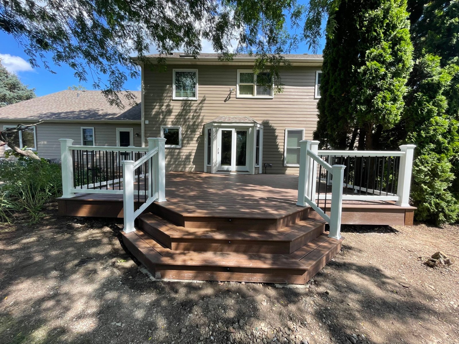 Trex Decking in Cinnamon Cove, paired with Trex Select T-Rail, in white with black aluminum balusters