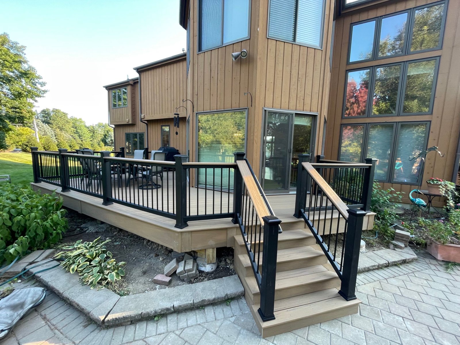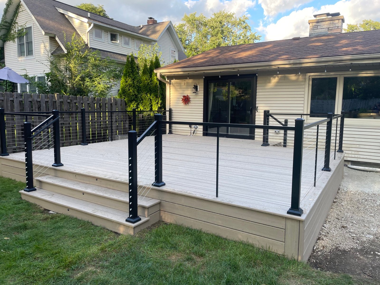 Timbertech decking in Coconut Husk, paired with all black Trex Select Rail with cocktail top rail.