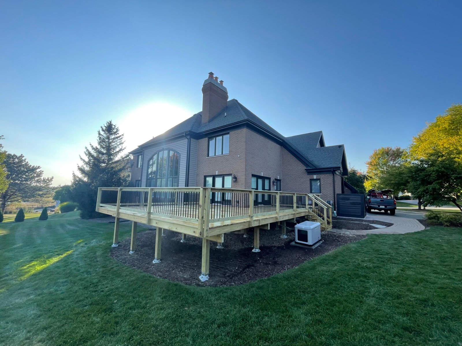 Treated pine decking. Treated Lumber rails, featuring polished black aluminum spindles.